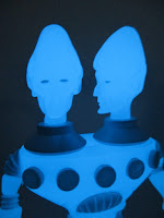The Outer Space Men is one of my favorite batches of toy designs ever, and I've still got tons of unreviewed figures. Granted, most of them are glow green, glow blue, or plain white... which is why I've been dragging my feet. I've got some really nice fully painted ones, and can't complain about a single one of them as a stand-alone thing. If they were doing new fully-colored figures, I'd be shouting their praises from the hills. And new characters? You couldn't shut me up if we got The Man from the Sun or The Woman from Ceres. But I've got eight two-headed guys on my shelves now. Check out Bluestar Gemini!